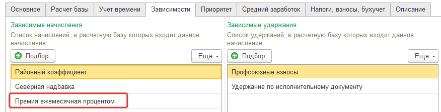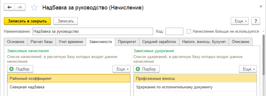 Пример. Нами была добавлена надбавка за руководство. В свою очередь, эта надбавка может входить в расчет базы других начислений и удержаний – см. закладку "Зависимости".