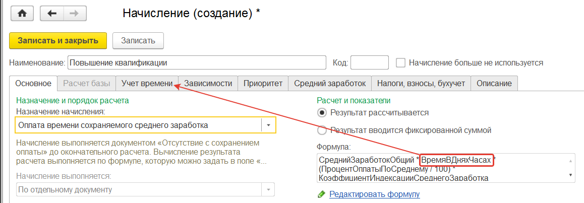А) Добавим новое начисление, укажем наименование "Повышение квалификации". Назначение начисления – оплата времени сохраняемого среднего заработка. Формула расчета начисления заполнена автоматически, в ней присутствует показатель времени.