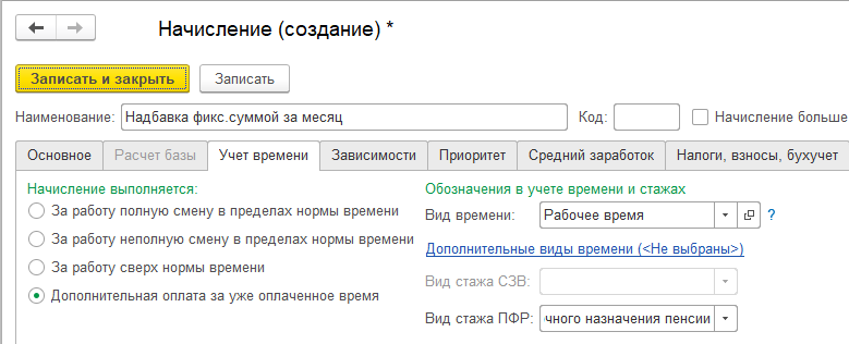Дополнительное начисление за уже оплаченное время (дополнительное начисление в пределах нормы времени). Время, отработанное по виду начисления, дополнительно оплачивается в пределах нормы времени. Это такие начисления как, доплата за ночные часы, доплата за совмещение профессий или надбавка за ученую степень. Чаще всего такие начисления не влияют на стаж в ПФР.