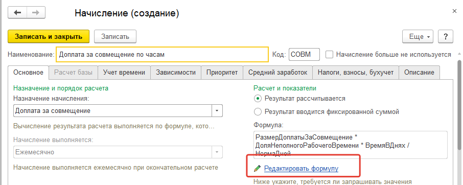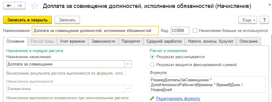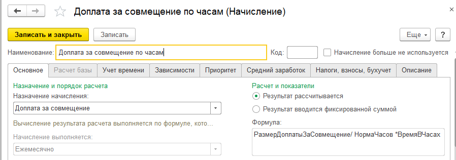 2. Если в организации часть сотрудников работает на пятидневных графиках, а часть – на сменных, то скорее всего, потребуются отдельные настройки начислений, связанных с отработанным временем: по дням и по часам. Так в учебной базе при выполнении начальной настройки было добавлено начисление "Доплата за совмещение должностей, исполнение обязанностей".