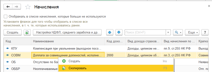 Добавим еще одну доплату за совмещение, скопировав настройки с типового начисления.