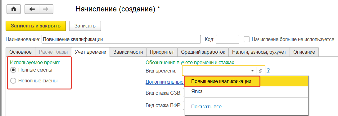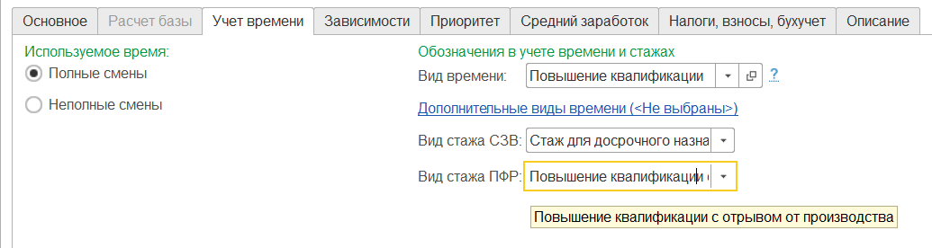 При начале эксплуатации программы крайне желательно убедиться, что для всех имеющихся в базе начислений с настройкой учета времени "За работу в полную смену в пределах нормы времени" и "Полные смены" проставлен вид стажа ПФР и выбран корректный вид времени.