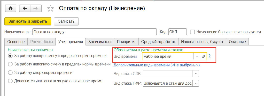 На закладке "Учет времени" убедимся в том, что вид времени выбран – рабочее время. Остальные настройки оставим по умолчанию. Запишем и закроем начисление.