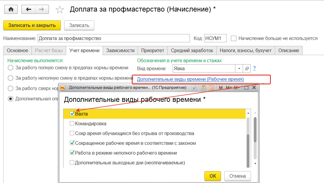 - как будет учитываться время за период действия начисления в регистрах: в качестве отработанного времени по норме либо сверх нормы, как неотработанное время, либо как дополнительное начисление за уже оплаченное время;