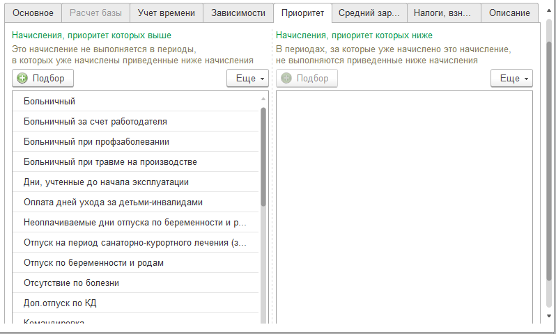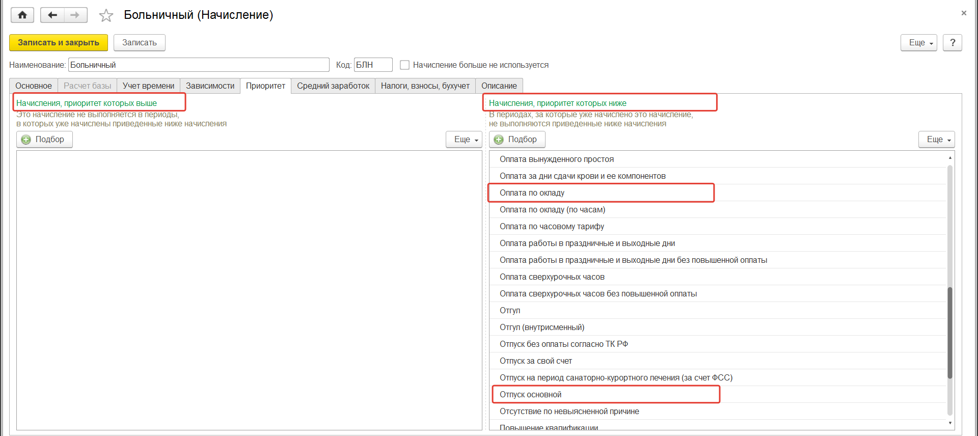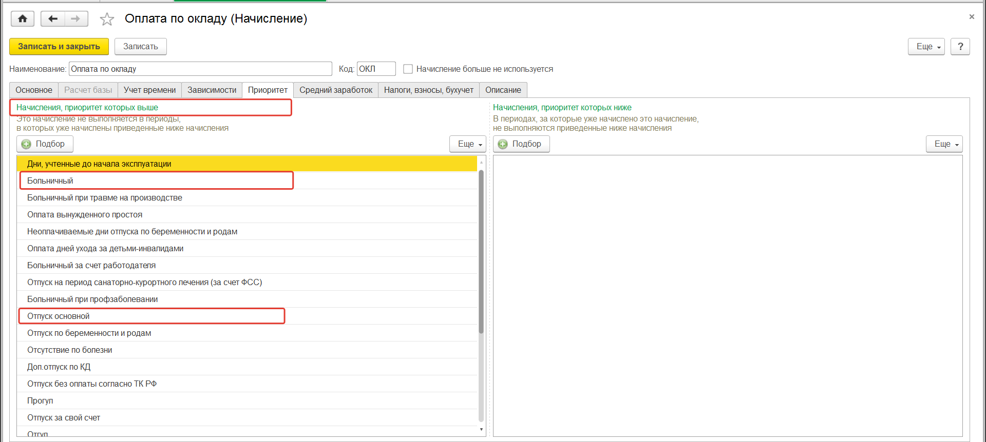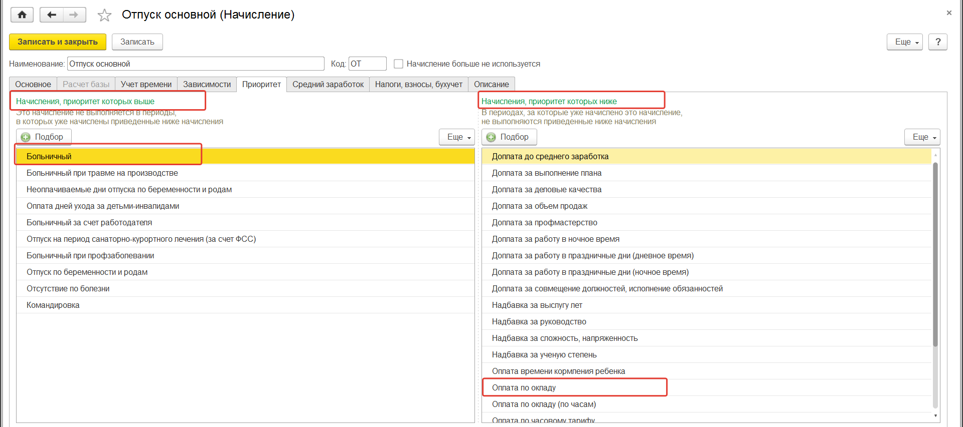 В некоторых случаях настройки приоритета проставляются автоматически (например, для начислений с назначением – Повременная оплата труда и надбавки), в других случаях их нужно добавить самостоятельно.