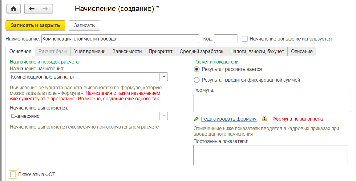 Зададим формулу для этого начисления. Нам потребуется создать новый показатель – компенсация проезда в день. Показатель может быть настроен двумя способами: