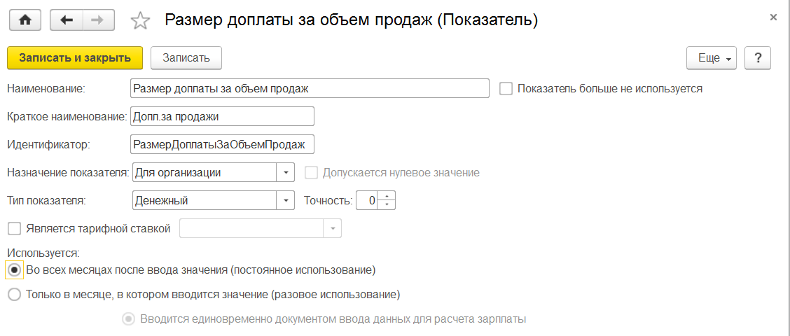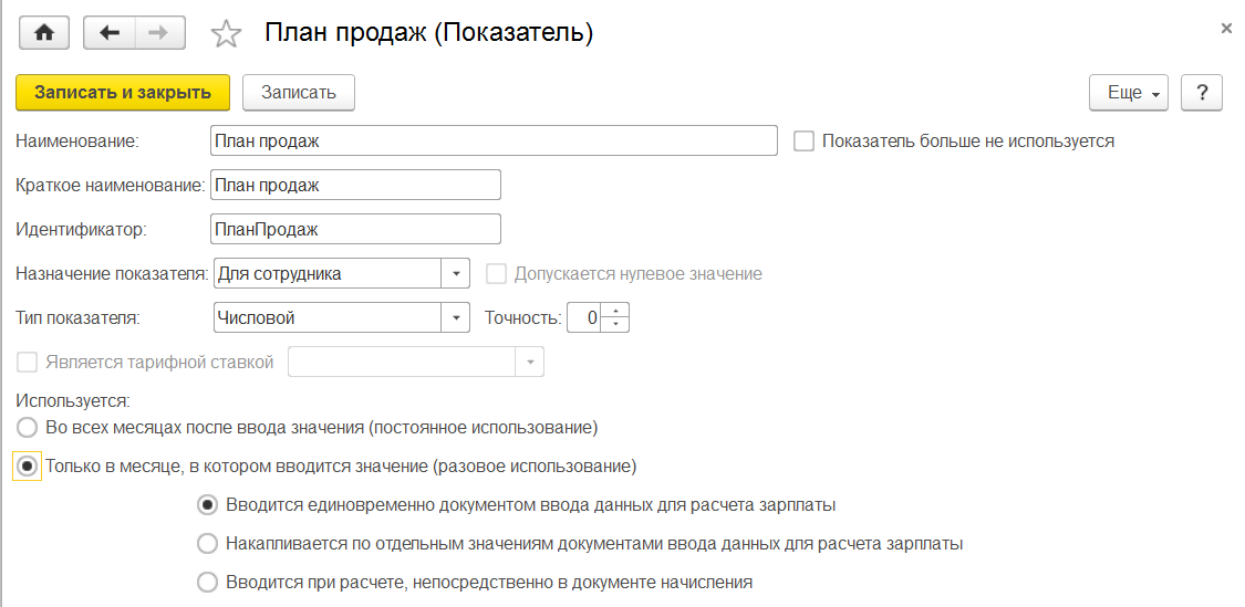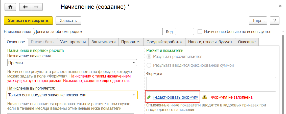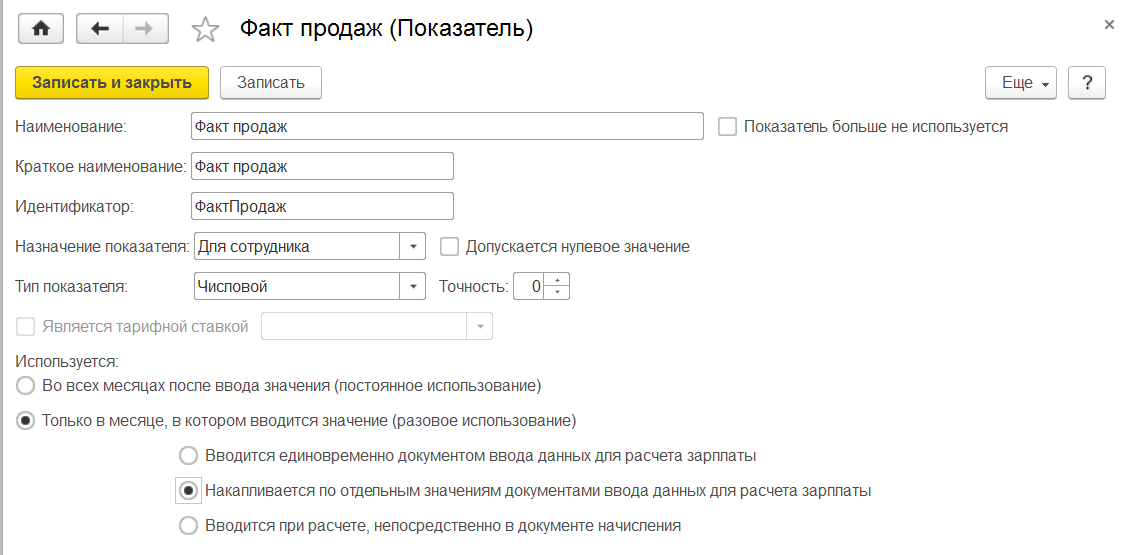 Г) Начисление будет выполняться только в том случае, если в этом месяце у сотрудника будет факт продаж. Укажем факт продаж в качестве определяющего показателя. Остальные настройки оставим пока по умолчанию, запишем и закроем начисление.