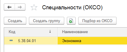 Если необходимо ввести специальность, не используя подбор из ОКСО, достаточно нажать кнопку "Создать". В рамках учебного примера выполним подбор из ОКСО по отдельной команде.