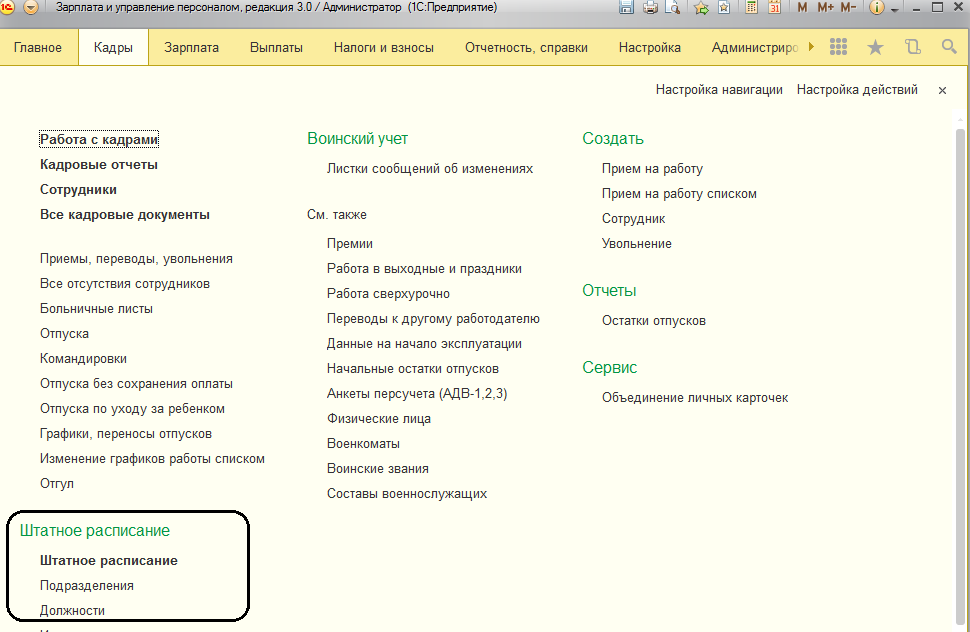 После включения возможности ведения штатного расписания в настройках программы в разделе "Кадры" будет доступен одноименный справочник. При ведении штатного расписания без сохранения история изменения с помощью приказов добавление и закрытие позиций осуществляется непосредственно в форме справочника.
