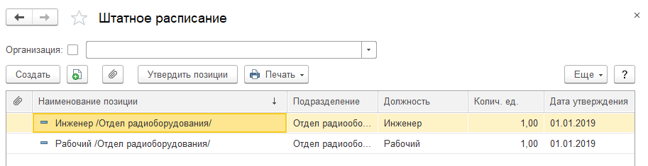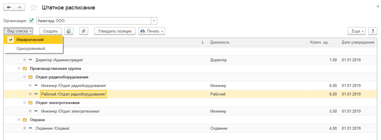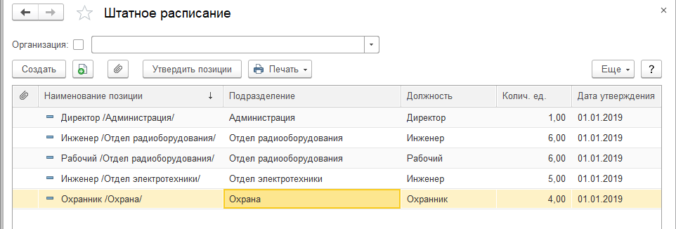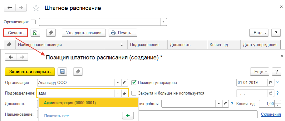 Дополним штатное расписание ООО "Авангард" и введем несколько позиций на 01.01.2019 непосредственно в справочнике "Штатное расписание" по команде "Создать".