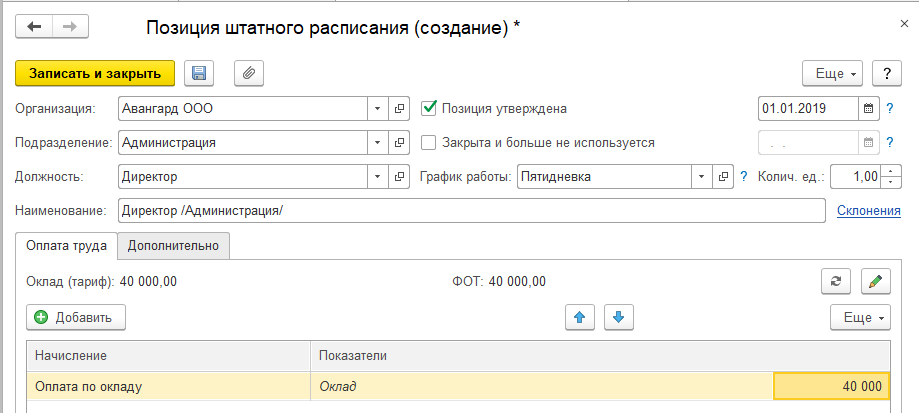 Позиция утверждена 01.01.2019, График работы – Пятидневка, 5 ставок;