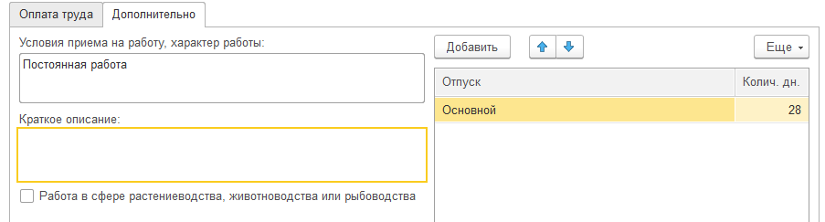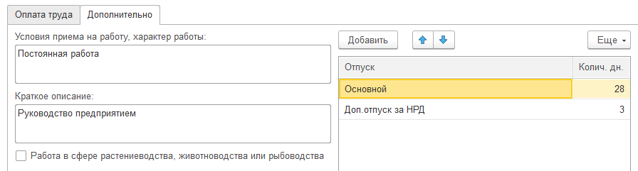 Заполним закладку "Дополнительно": условия приема на работу – Постоянная работа, описание – Руководство предприятием, право на основной отпуск 28 дней, доп. отпуск за ненормированный рабочий день 3 дня.