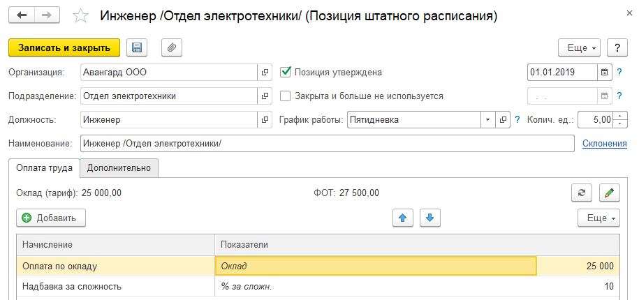 2. Аналогичным образом добавим позицию "Инженер/ Отдел электротехники":