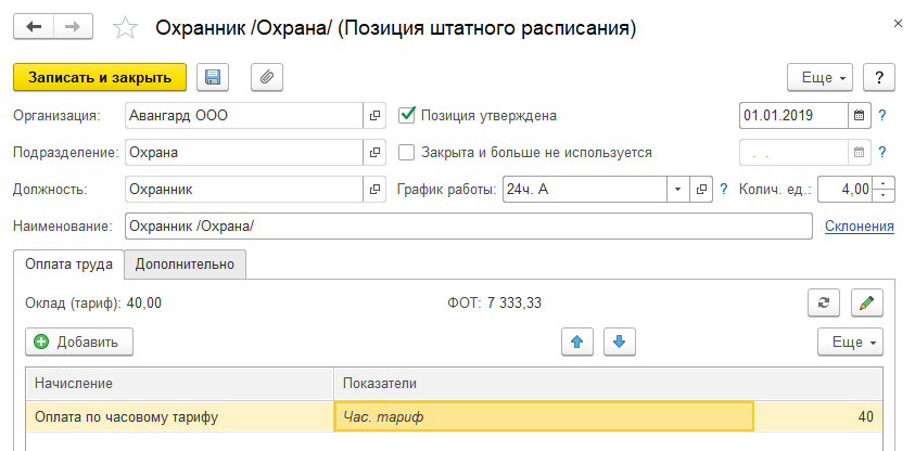Позиция утверждена 01.01.2019, График работы сменный – 24ч. А, 4 ставки;