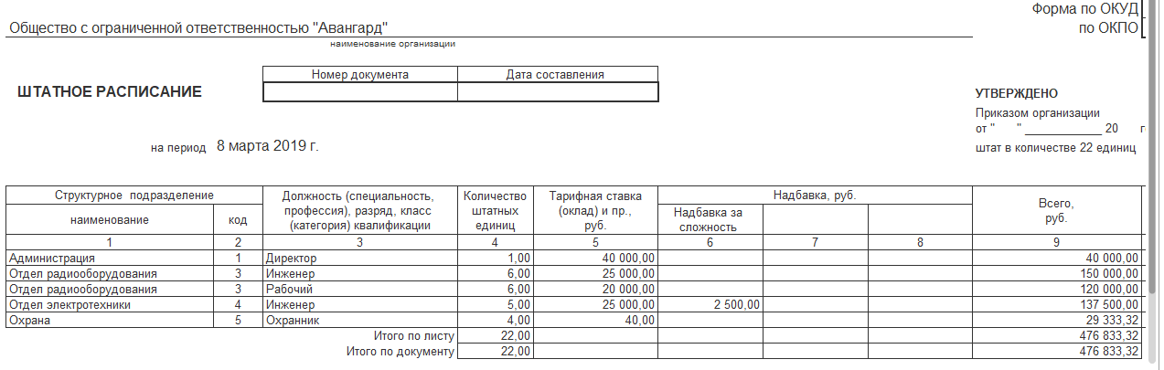 Таким образом, штатное расписание для ООО "Авангард" составлено.