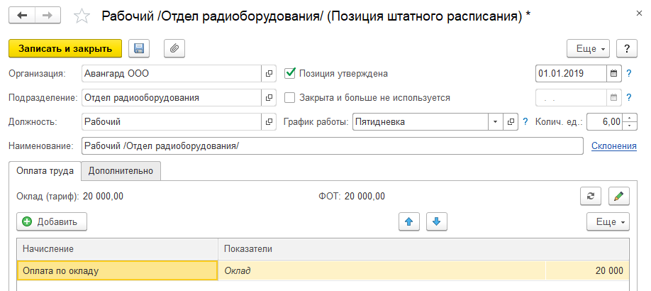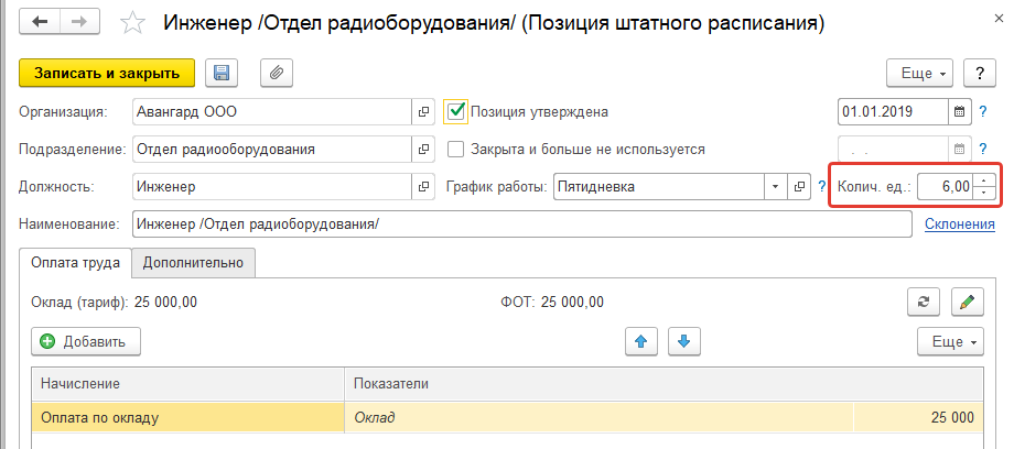 Откроем карточку позиции инженера в отделе радиооборудования и уточним количество штатных единиц = 6.