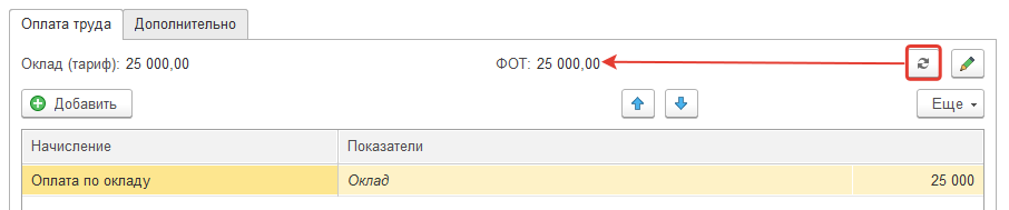Если начисление входит в ФОТ и показатели начисления известны (например, процент надбавки к окладу составляет 15%), то ФОТ рассчитывается автоматически или по кнопке "Пересчитать".