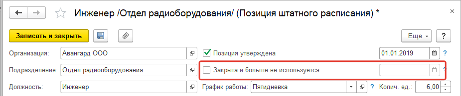 В последующем для закрытия позиции можно указать флаг "Закрыта и больше не используется" и дату исключения позиции из штатного расписания. Обратите внимание, что в таком случае для подразделения и должности отдельно устанавливается дата расформирования в их карточках, если они окончательно исключены из кадровых данных и более не будут использоваться.