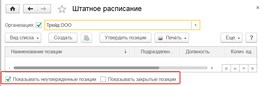 При этом в списке позиций штатного расписания можно будет отображать как закрытые позиции, так и еще не утвержденные. Неутвержденные позиции отмечаются жирным шрифтом, закрытые – зачеркнутым.