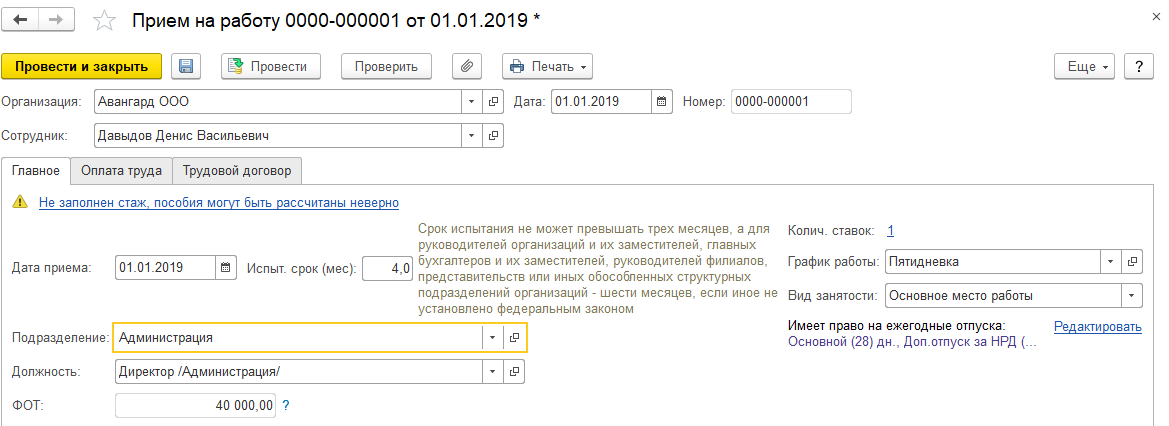- В документе может быть указан испытательный срок – он указывает при необходимости в месяцах. При этом при вводе испытательного срока более 3х месяцев программа выдает подсказку-предупреждение;