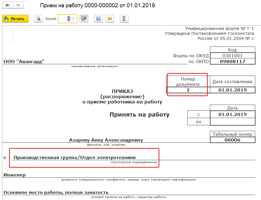 Нумерация документов "Прием на работу" и "Прием на работу списком" отдельная. Номер и дата документов выводятся в печатную форму приказа о приеме. При вводе документа, датированного 05.04.2017, и указании даты приема 30.03.2017, дата документа будет автоматически изменена на 03.04.2017 (не позже трех дней от даты приема с учетом выходных).