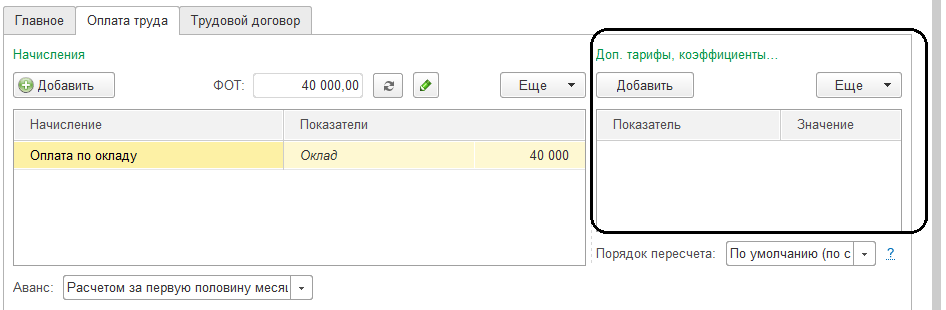 - Если в настройках расчета зарплаты программы также установлен флаг "Используется несколько тарифных ставок для одного сотрудника", то в документе будет доступна дополнительная табличная часть для ввода коэффициентов и дополнительных тарифных ставок. Напомним, что такую настройку целесообразно использовать с несколькими видами рабочего времени в графике работы (см. раздел по штатному расписанию).