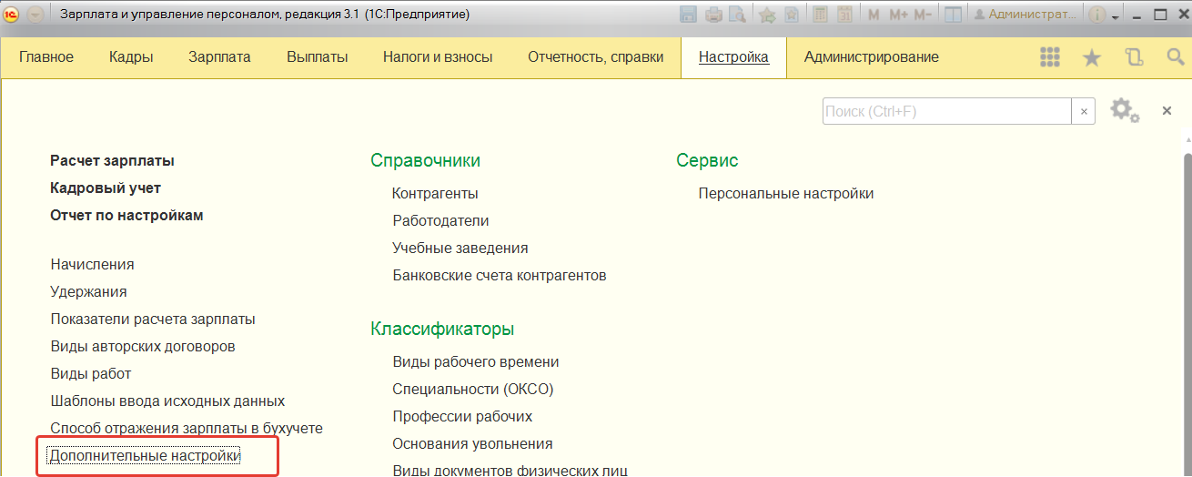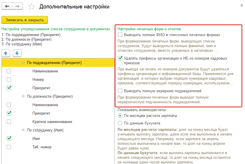 Дополнительные настройки состоят из трех частей: настройки формирования списков сотрудников в списочных документах, настройки печатных форм, настройки вывода отчетов. В данном разделе актуально рассмотреть именно настройки печатных форм.
