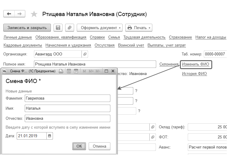 Изменения можно вносить как через карточку физического лица, так и через карточку сотрудника.