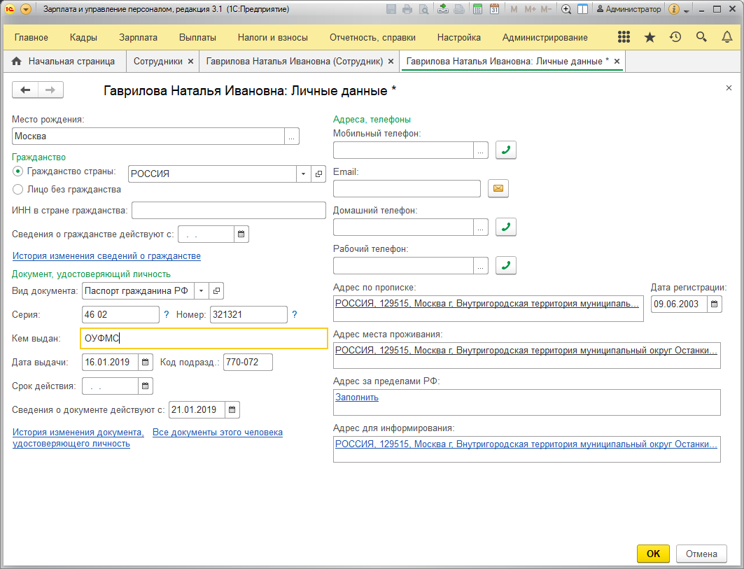 Основная информация о сотрудниках, такая как фамилия, имя и отчество, гражданство, паспортные данные, может изменяться во времени.