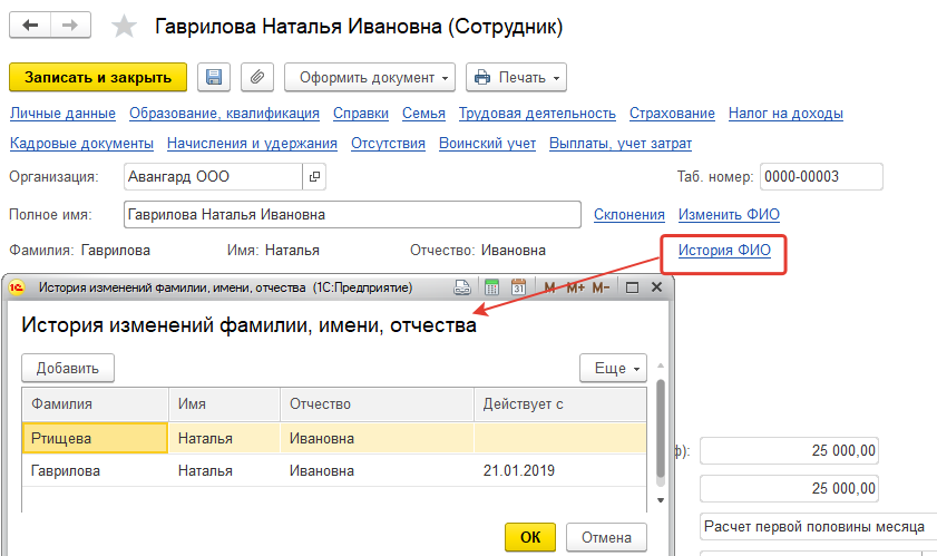 История изменения ФИО сотрудника можно просмотреть по ссылке "История ФИО".