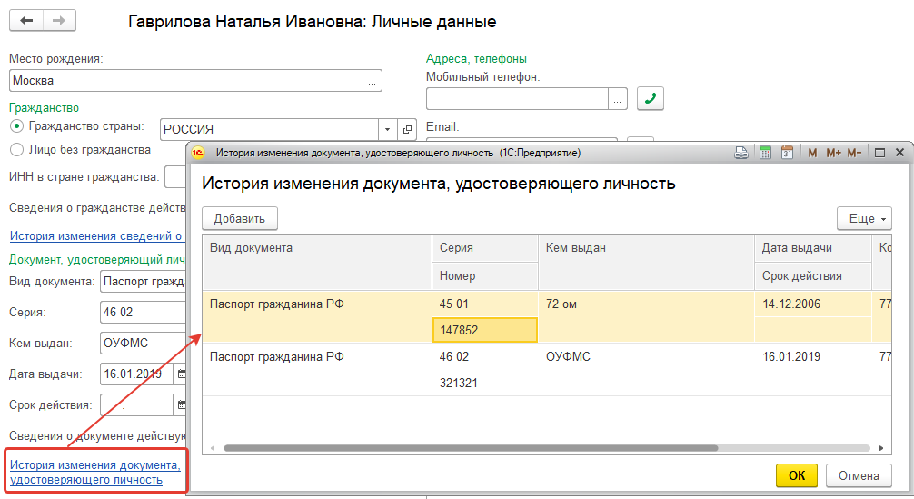 Также следует изменить данные паспорта: паспорт гражданина Российской Федерации: серия 46 02 номер 321321 выдан ОУМФС код подразделения 770-001 16.01.2019, срок действия с 21.01.2019
