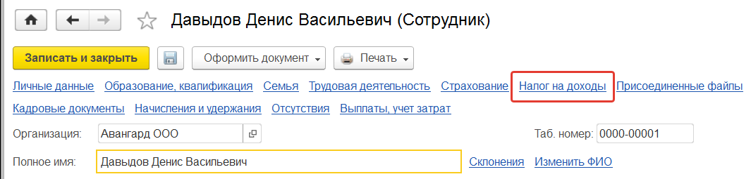 Всем физическим лицам, добавленным в информационную базу, по умолчанию устанавливается статус налогоплательщика – резидент. Это означает, что доходы такого сотрудника в общем случае облагаются по ставке налога на доходы физических лиц (НДФЛ) 13%. Если же физическое лицо имеет иной статус для целей налогообложения НДФЛ, то в программу необходимо внести данные сведения также по ссылке "Налог на доходы" в карточке сотрудника.