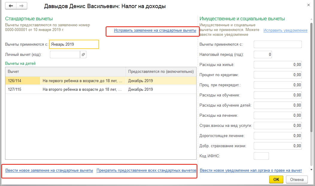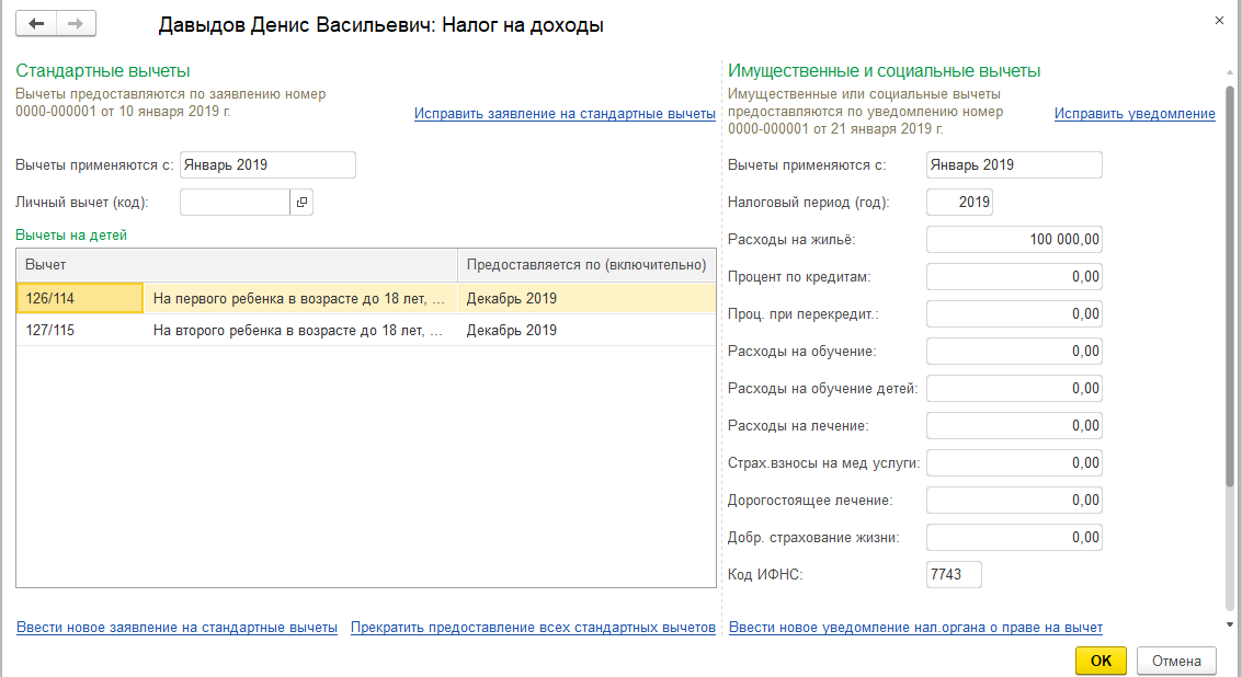 После проведения заявления на вычет форма налога на доходы изменится: в ней будут отображаться данные о предоставленных вычетах, а также будет возможность исправить либо прекратить вычеты по соответствующим ссылкам.