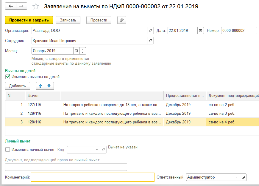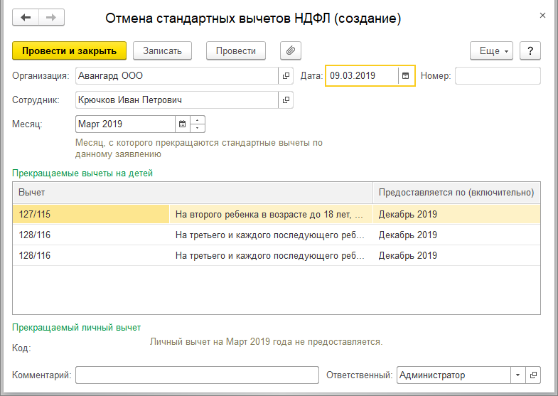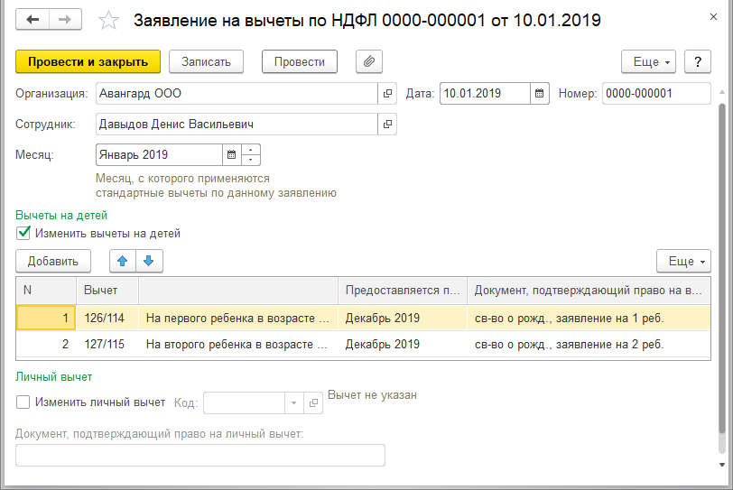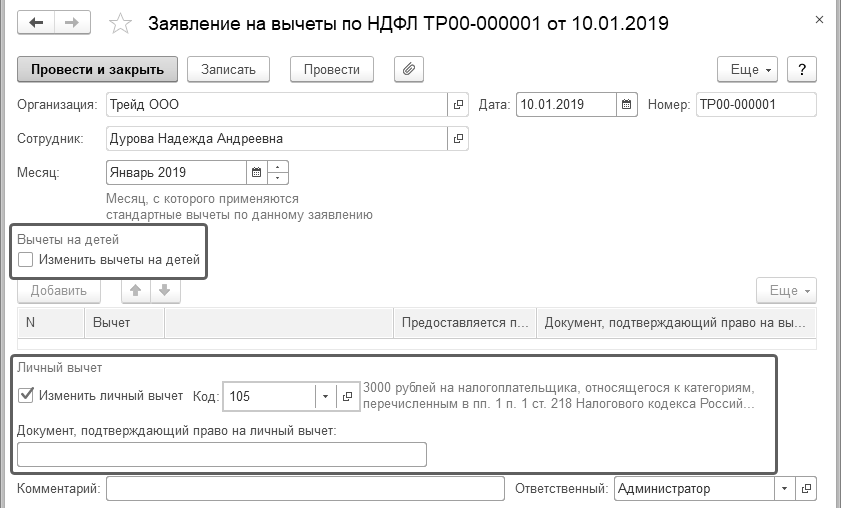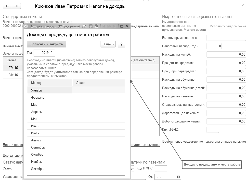 Из карточки сотрудника перейдем по ссылке "Налог на доходы" и введем право на личный стандартный вычет по коду 105 с января 2019г.