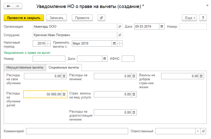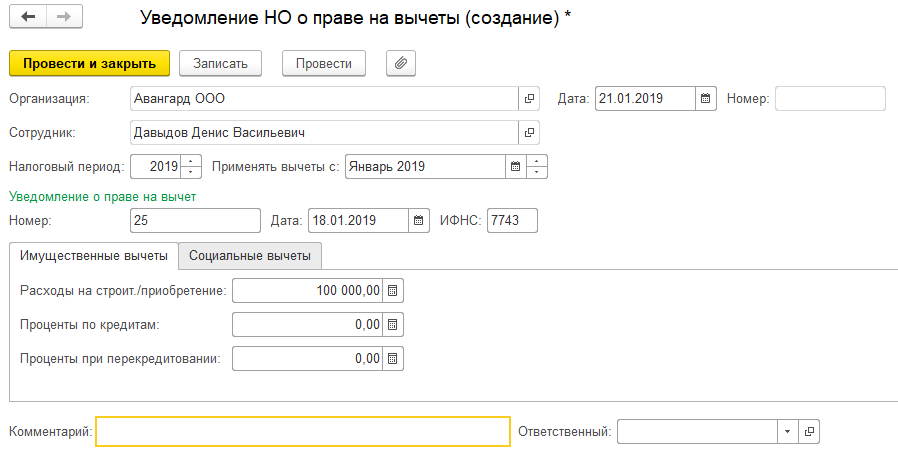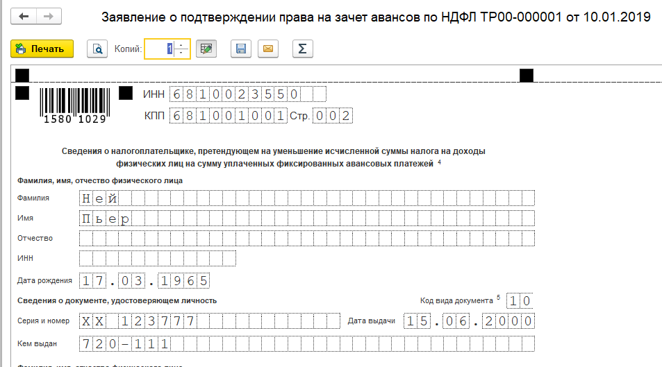В документе указывается: налоговый период, реквизиты уведомления ИФНС и данные авансового платежа. Данные сведения будут учитываться при расчете НДФЛ в программе.