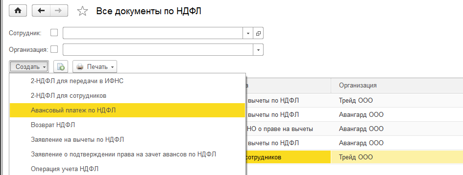 1) Необходимо зарегистрировать уведомление ИФНС на право уменьшения налога на авансовые платежи по патентам. Сделать это можно с помощью документы "Авансовый платеж по НДФЛ", который вызывается в разделе "Налоги и взносы / Все документы по НДФЛ".