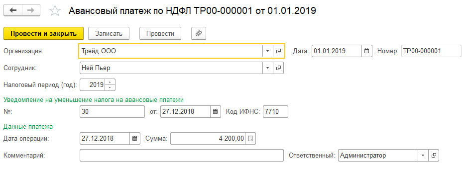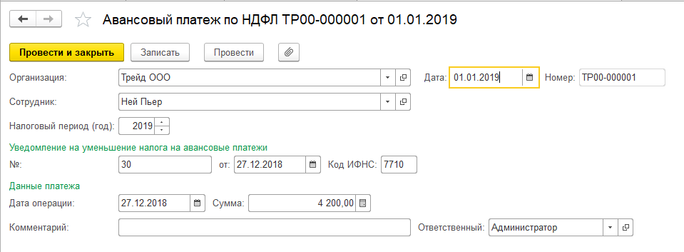 4) В разделе "Налоги и взносы" перейдем по ссылке "Все документы НДФЛ" и введем данные уведомления ИФНС об уплате авансового платежа. Проведем документ.