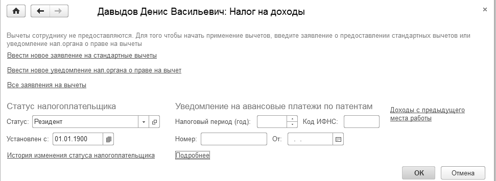 От статуса налогоплательщика зависит код статуса налогоплательщика в отчетности и применяемая к доходам ставка по НДФЛ (например, доходы нерезидентов облагаются по ставке 30%, нерезидентов, работающих по патенту – 13%). Также указывается дата, с которой применяется данный статус.