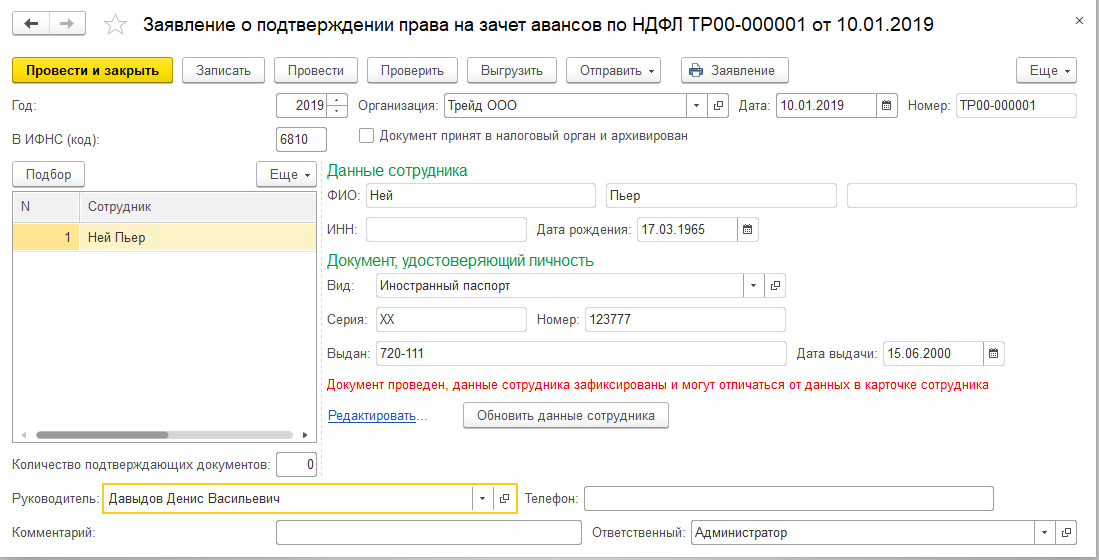 Сохраним данные по команде ОК. Запишем данные сотрудника.