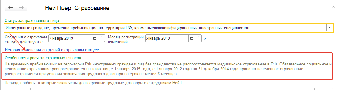 По умолчанию все сотрудники являются гражданами РФ и подлежат страхованию в полном объеме. Если сотрудник имеет особенности расчета страховых взносов, то нужно уточнить статус застрахованного лица и дату, с которой действует данный статус.