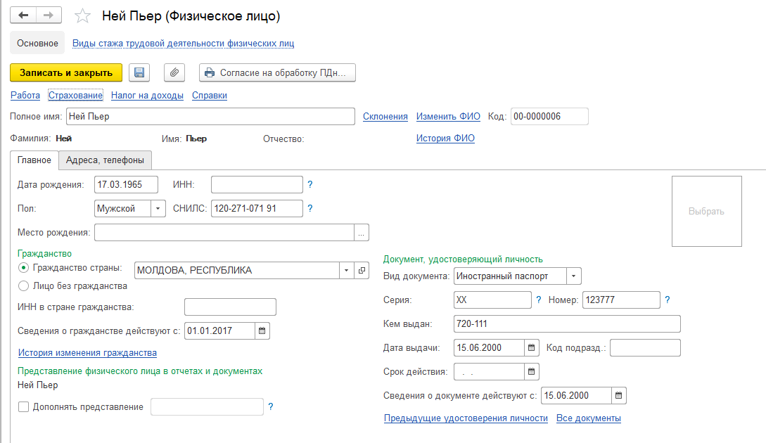 Примем на работу в ООО "Трейд" сотрудника-иностранца. Откроем справочник "Физические лица" и найдем там П.Нея. Откроем карточку данного физического лица. Обратите внимание на состав его личных данных: указано гражданство иной страны, иностранный паспорт.
