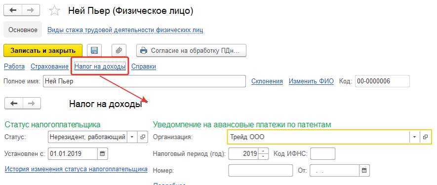 1) Перейдем по ссылке "Налог на доходы" и укажем статус налогоплательщика – нерезидент, работающий по найму на основании патента.