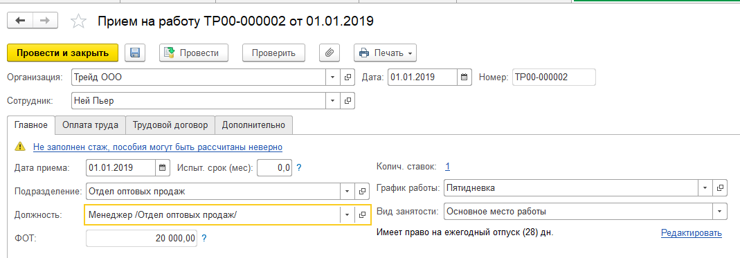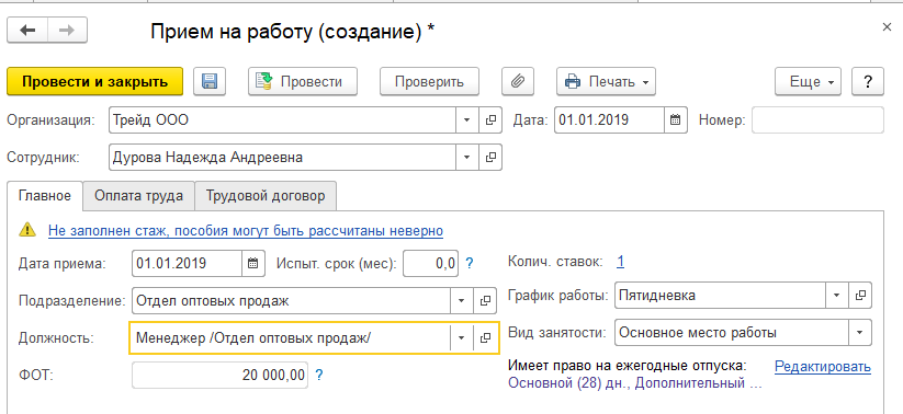 Оформим прием на работу в ООО "Трейд" на 01.01.2019 на следующие условия: