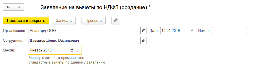 В документе указывается организация, налоговый период и сотрудник либо сотрудники, по которым подается заявление. Из формы документа можно вывести на печать форму заявления по приказу ФНС России.