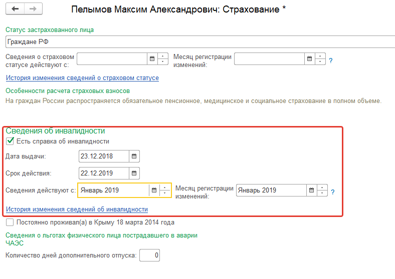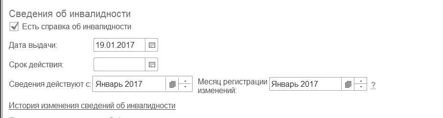 Сведения по инвалидности также вносятся по ссылке "Страхование". При внесении изменений в данные об инвалидности, необходимо указывать дату, с которой эти изменения актуальны, поскольку в конфигурации хранится история изменения инвалидности. Если в результате переосвидетельствования человека признали полностью трудоспособным, необходимо снять флажок "Инвалидность" и указать с какой даты это происходит. Месяц регистрации изменений требуется для перерасчетов "задним числом" и отражении данных перерасчетов в отчетности.