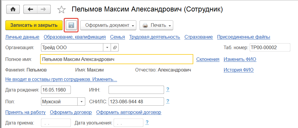 Примем на работу сотрудника с инвалидностью в ООО "Трейд". Для этого в справочнике "Сотрудники" добавим нового сотрудника Пелымов Максим Александрович (такое физическое лицо уже есть в справочнике), заключившего договор с ООО "Трейд". Запишем сотрудника.