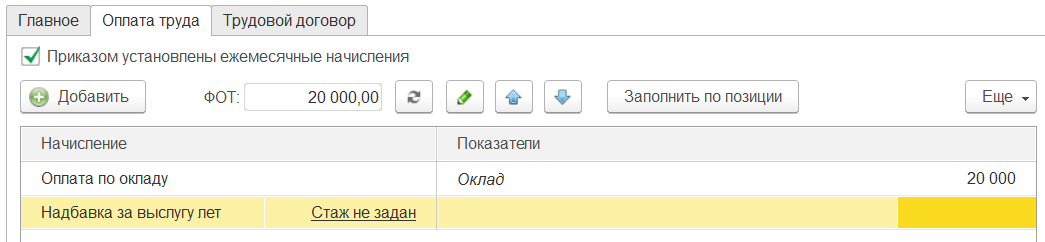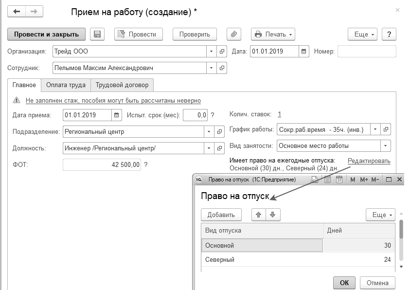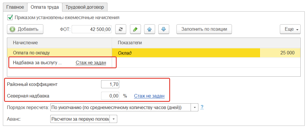 Обратите внимание, что сотрудник принимается на работу в северное подразделение. Поэтому ему полагается также северный отпуск. Кроме того, на закладке "Оплата труда" данные заполнены по позиции штатного расписания, в том числе региональные надбавки. Обратите внимание, что для северной надбавки потребуется задать северный стаж, это мы рассмотрим в разделе по стажам далее.