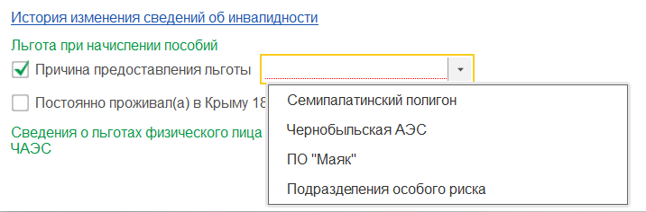 Если при расчете государственных пособий за счет ФСС физическому лицу должна предоставляться льгота в связи с тем, что он подвергался радиации, то по ссылке "Страхование" в разделе "Льгота при начислении пособия" отмечается наличие льготы и ее основание.