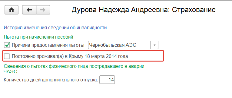 По ссылке "Страхование" укажем право на отпуск ЧАЭС – 14 дн., запишем сотрудника.