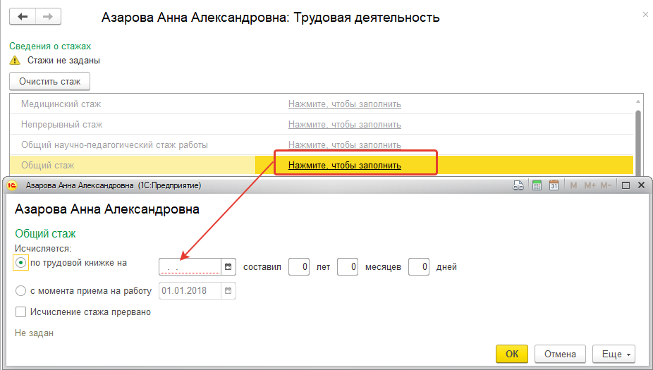 1. Внесем сведения о стажах для сотрудника ООО "Авангард" А.А. Азаровой.